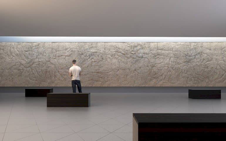 Værket får nye rammer i en "Pietas Pavillon" skabt i samarbejde mellem billedkunstneren Ingvar Cronhammar og arkitekt og partner i Friis & Moltke Palle Hurwitz.