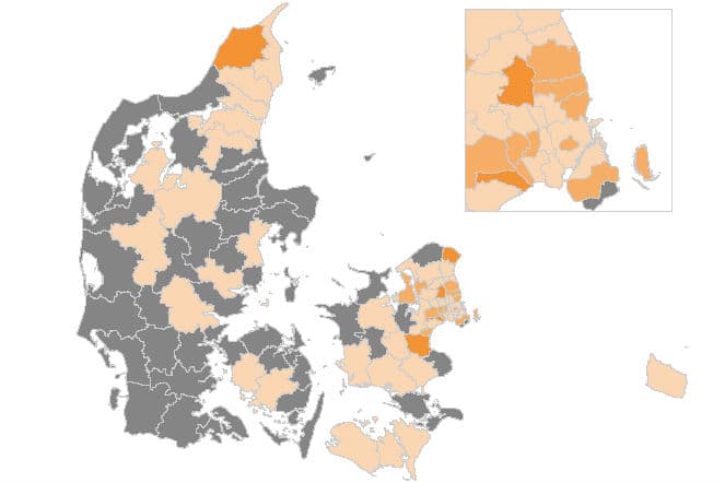 Ifølge DK Nyts beregninger er antallet af nye tilfælde siden i går spredt over mange kommuner med flest, nemlig 12, i København, der som bekendt også er landets største.