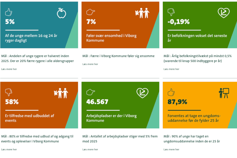 Fx kan man her se, at det allerede er lykkedes at nå mål om at genanvende 55 pct. af husholdsningsaffaldet og om, at mindst 85 pct. af borgerne skal være fysisk aktive, mens det endnu ikke er lykkedes at nå målene om en årlig befolkningsvækst på en halv pct. eller målet om, at 80 pct. skal være tilfreds med udbuddet af events og oplevelser.