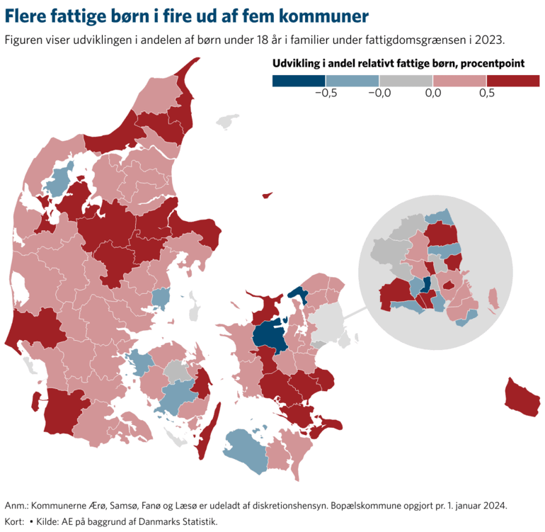 Stigning i antallet af fattige børn er et landsdækkende fænomen, selvom enkelte kommuner har set en kraftigere stigning end andre. I fire ud af fem kommuner voksede andelen af fattige børn. Samtidig voksede forskellene i udbredelsen af børnefattigdom mellem kommunerne.