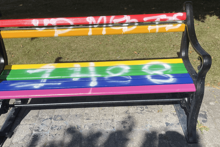 Bænken har efterhånden været udsat for lidt af hvert. De to første gange blev bænkens farver dækket med sort maling. Den tredje gang var det med blå maling, og i weekenden blev racistiske budskaber samt tallet 1488, der bliver brugt i nynazistiske kredse, spraymalet på regnbuen.