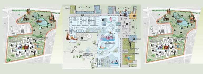 Første etape, der påbegyndes efter godkendt lokalplan, vil bestå af ca. 81.100 m² byggeri fordelt på 51.000 m² ferieboliger, 12.000 m² aquapark, 6.000 m² forlystelser, butikker, cafeer og restauranter samt 12.000 m² hotel og konferencefaciliteter. Når alle fem etaper er bygget, vil der være en samlet ferie- og forlystelsesby på 360.000 m². Dertil kommer så den rekreative naturpark.
