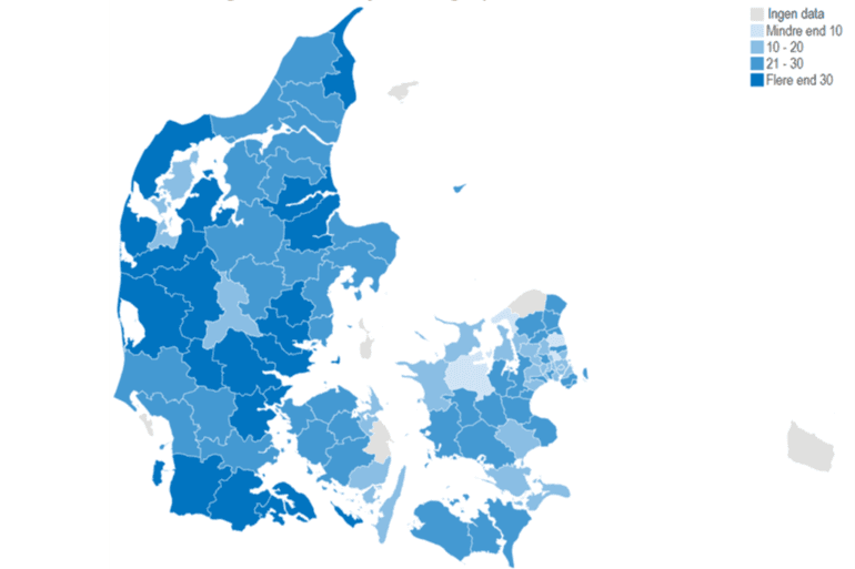 Det højeste antal udlån af fysiske bøger pr. elev var i Ringkøbing-Skjern og Kolding, hvor der i gennemsnit blev udlånt 44 fysiske bøger pr. elev. Eleverne i den vestlige del af Danmark låner i gennemsnit flere fysiske bøger end eleverne i den østlige del.