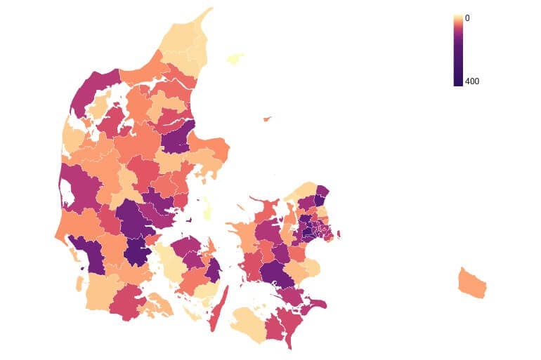 Omvendt er kun ti kommuner nu under bekymringsgrænsen på 20, nemlig Læsø, Samsø, Middelfart, Svendborg, Assens, Halsnæs, Frederikshavn, Ærø, Brønderslev og Lolland. I går var 24 kommuner under grænsen. Det kan dog spille ind, at tallene nu opgøres på en ny måde - se længere nede.