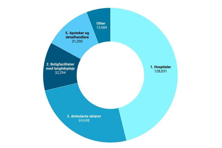 128 mia. kr. svarende til 46 pct. af sundhedsudgifterne kunne henføres til somatiske, psykiske eller specialhospitaler. Dernæst er det ambulante aktører, hvor 70 mia. kr. svarende til 25 pct. kunnes henføres til. De ambulante aktører består af praksissektoren, tandlæger, øvrige sundhedsklinikker, ambulante sundhedscentre samt sygepleje og personlig pleje i regi af hjemmeplejen.