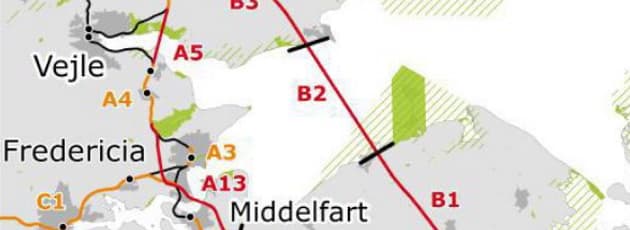 - Kortere videreførelse af ny bane over Lillebælt - og mindre ambitiøs (200 km/t) - giver ca. 5 minutter